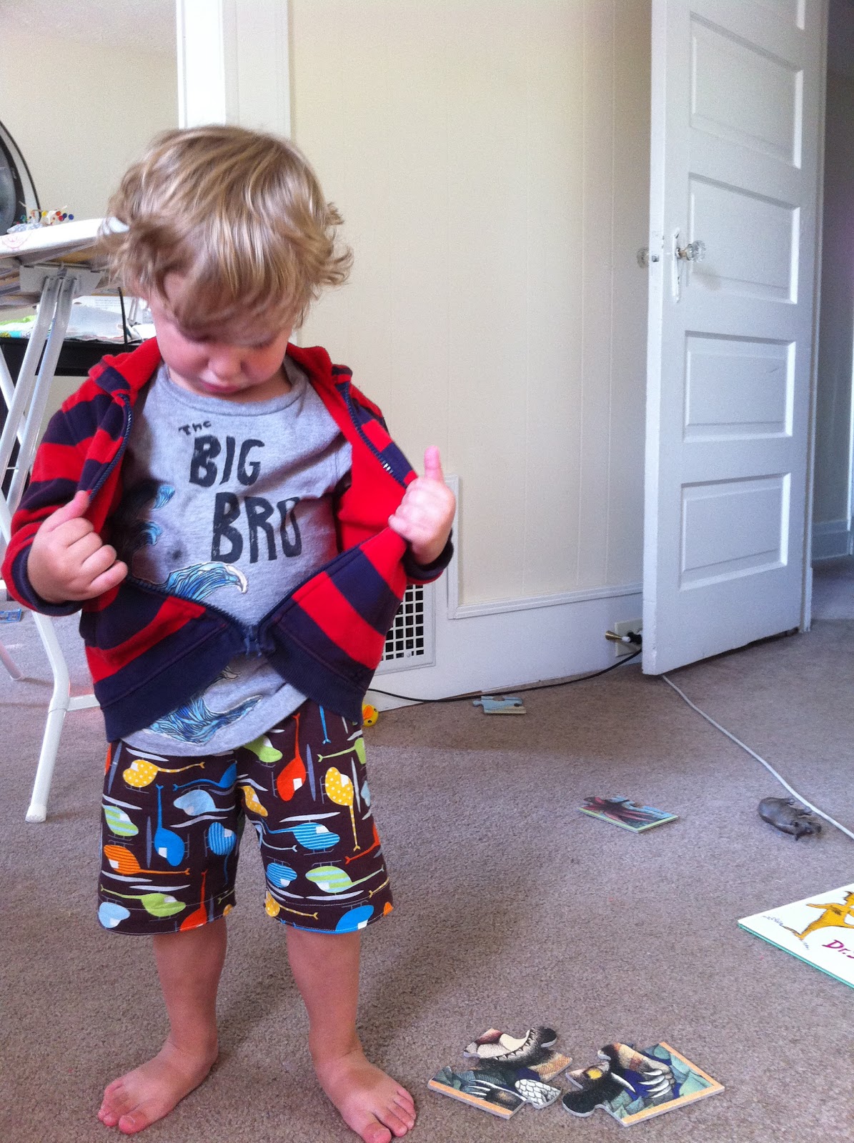 I made those helicopter shorts from Dana's beloved pattern of course. (That tee is from my last round of boy clothes, you can check out here.)
