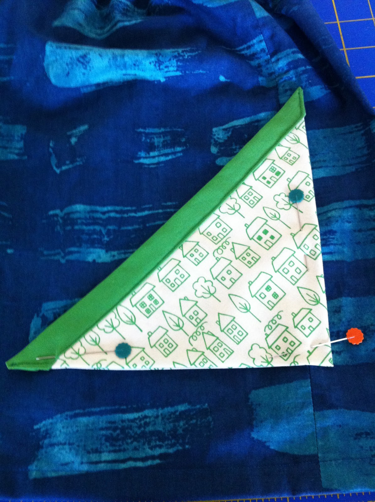 After figuring out the placement, take off the top layer of the pocket and pin the bottom triangle in place. Start at the bottom corner and edge stitch across the bottom and to the top corner. Be sure to backstitch at these corners to reinforce.